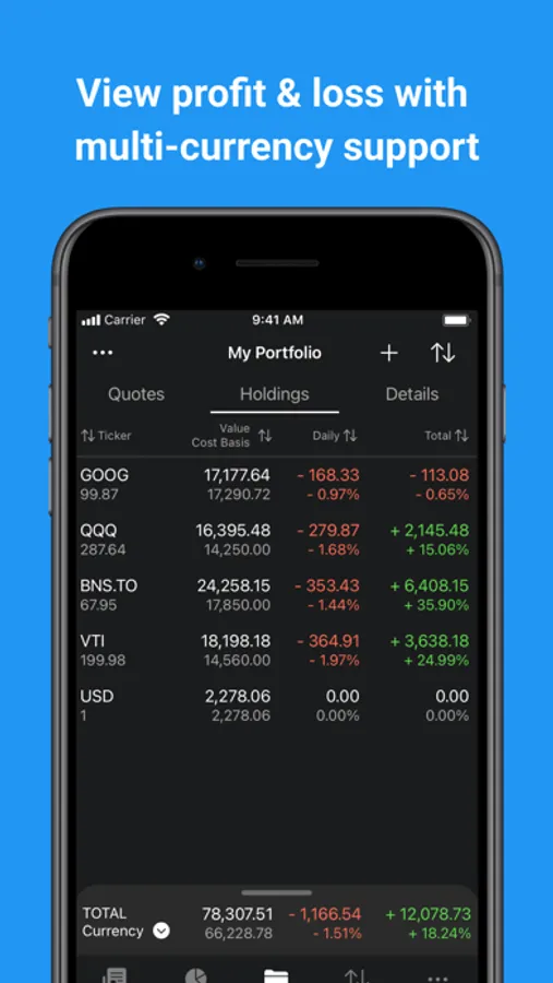- Convert stock portfolios to one currency using real-time foreign exchange rates - mix stock quotes and holdings from different stock markets and display it using a currency of your choice