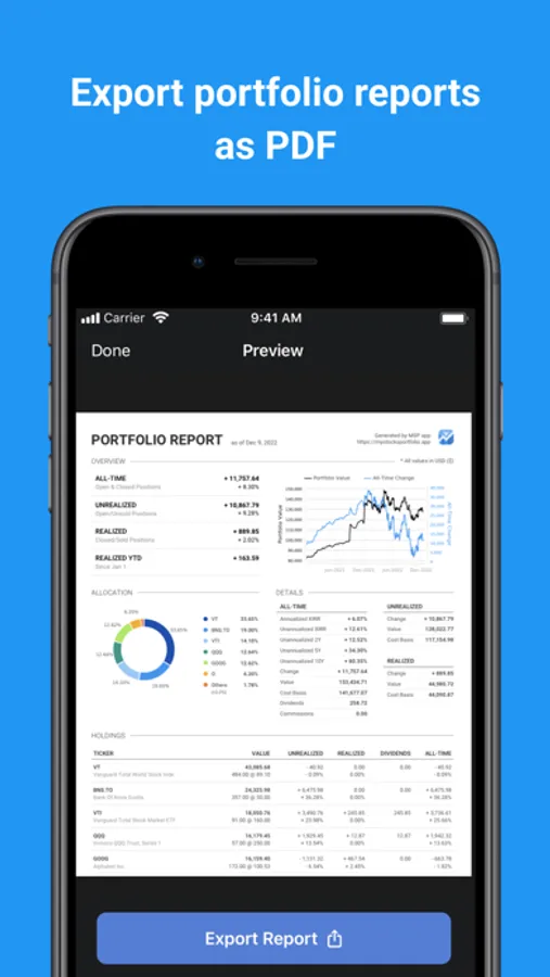 - Manage your stock portfolios and view performance over time, with metrics such as realized gains, unrealized gains, daily and total changes, and annualized gains