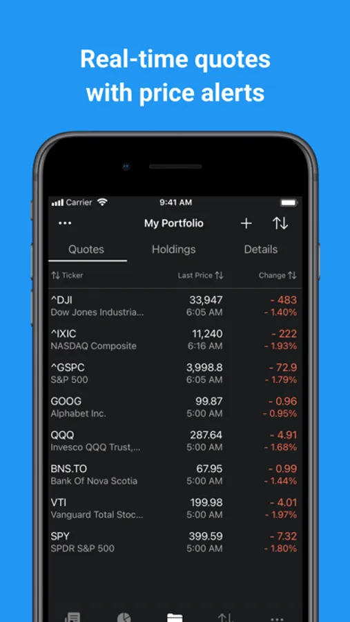 - Multiple stocks portfolios support - track multiple stock markets, stock portfolios, or watchlists