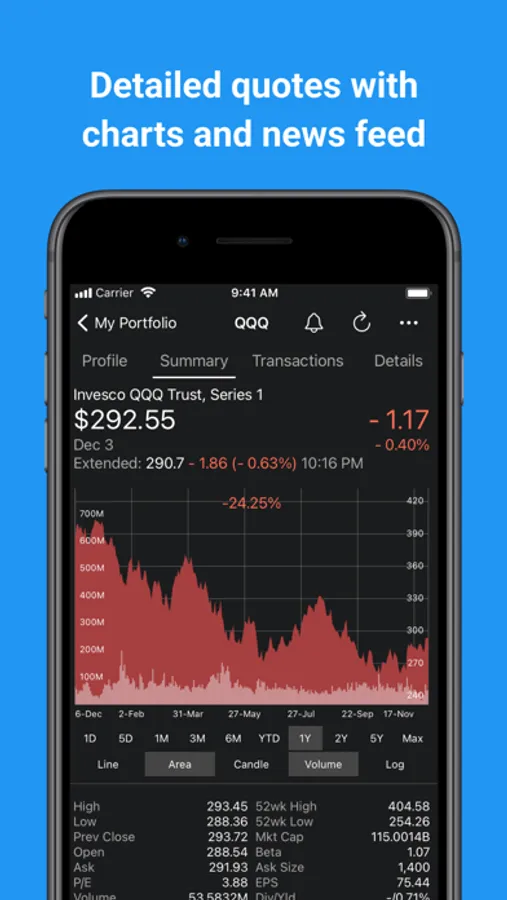 - Full screen charts. Line, Area, Candlestick, Logarithmic and more. Pinch-zoom, trackball, and panning support.