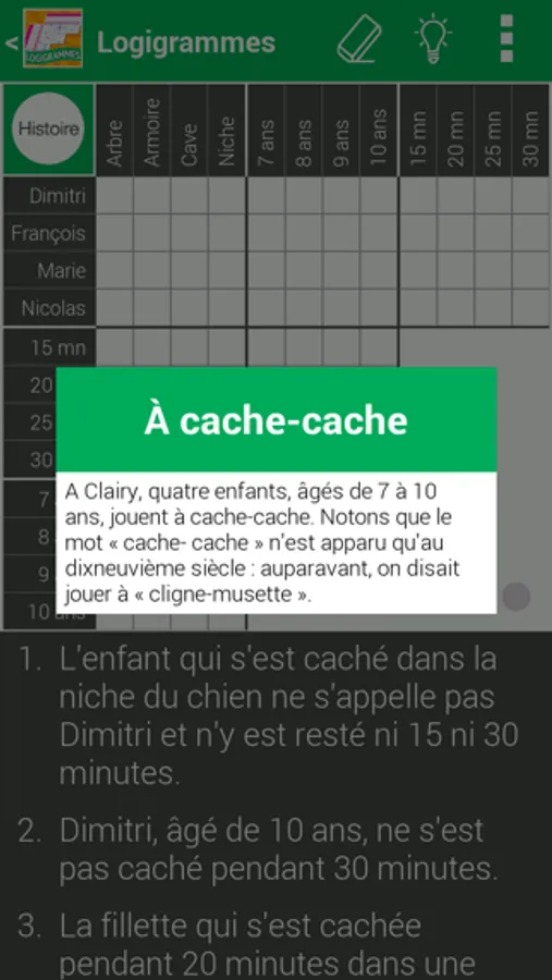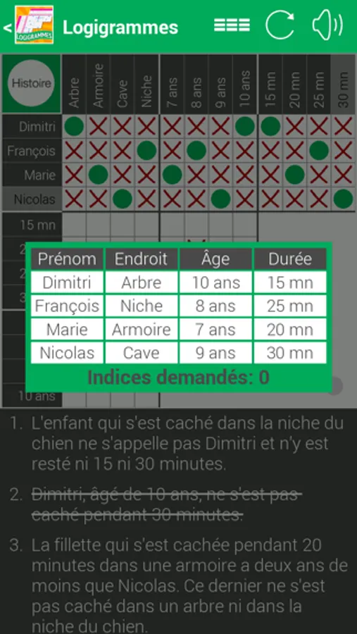 Learning French or trying to stay current? Try these French language Logic Grid Puzzles licensed from the popular Sport Cérébral® magazines. This app is completely in French. (If you're looking for logic puzzles in English, see our other apps.)