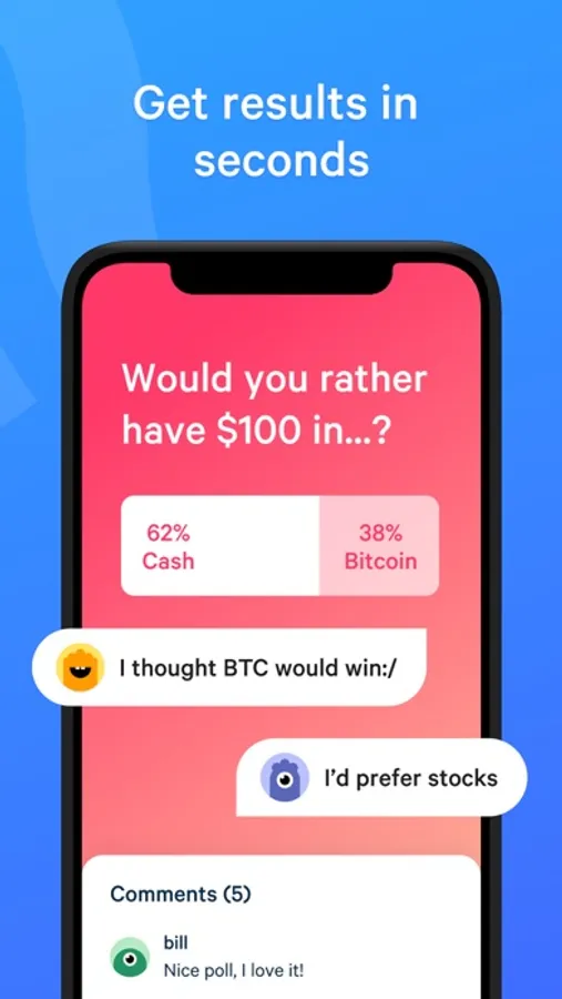Answer new surveys every day in over 20 categories, such as current topics, politics, or sports, and see what others think. Get hundreds of answers to your anonymous polls in just a few minutes. Level up, compete with the community, earn money and gift cards, or donate to social projects. Try now!