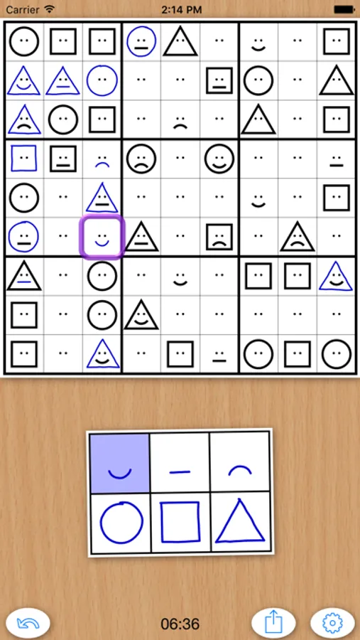 Kaodokus are a new variation of sudoku with symbols that are only partially given. Originally invented for Belgian Mensa magazine Commensal, kaodokus offer a lot more variety than ordinary sudokus. Instead of numbers, the cells contain smiley faces which can have three possible shapes and three possible mouths. Each of the nine unique combinations has to appear exactly once in each column, row or other marked area just like in a normal sudoku. The big novelty is that in some cells only the mouth or shape is given, leaving the missing part for you to find. You can even ask for grids that initially don't include a single full symbol! This makes the puzzle experience a lot richer, requiring complex strategies combining bits and pieces of information in original ways.