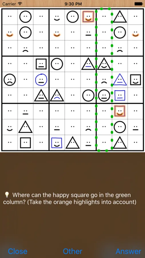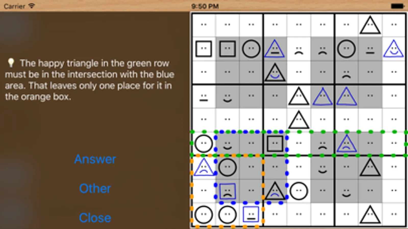 - Sophisticated hint system which actually suggests possible ways forward using step by step logic. Especially in the beginning this is very helpful since even the easiest kaodoku grids can be daunting for those not used to them.