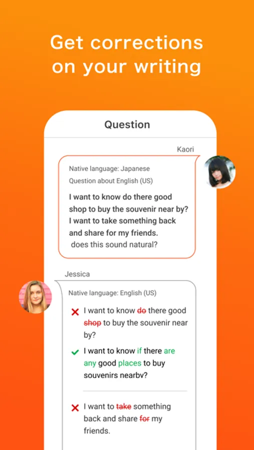 Correction Function - Have your writing corrected by native speakers!When you post in your target language, native speakers will show you natural ways to say what you want to say.