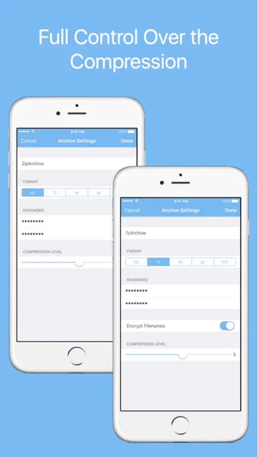 Setting a password for an archive and control over the compression rate allows you to manage compression with flexibility.