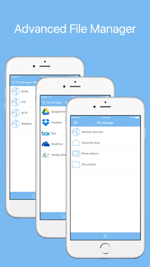 Full integration with popular cloud services (GoogleDrive, OneDrive, DropBox, Box, Yandex.Disk), with network services (SMB, FTP, SFTP, WebDAV, DLNA) and with your photo album allows access to your files from other devices.
