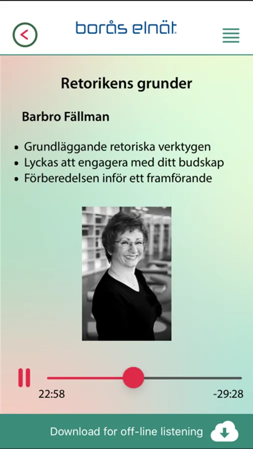 För att lyssna offline klickar du på download ikonen (orange nedåtpekande pil). Föreläsningarna finns på svenska och engelska. För mer info: www.mindit.se