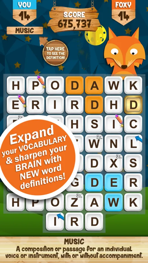In Words with Foxy you play against Foxy and compete to earn the most letter tiles on the board. Each letter used in a word will turn your color. Foxy will make words as well and turn the tiles to his color. There's no time limit, just turn for turn to see who can make the best words and own the most tiles at the end of each level. You need to beat Foxy in order to progress to the next level and there are many different levels to keep you occupied!
