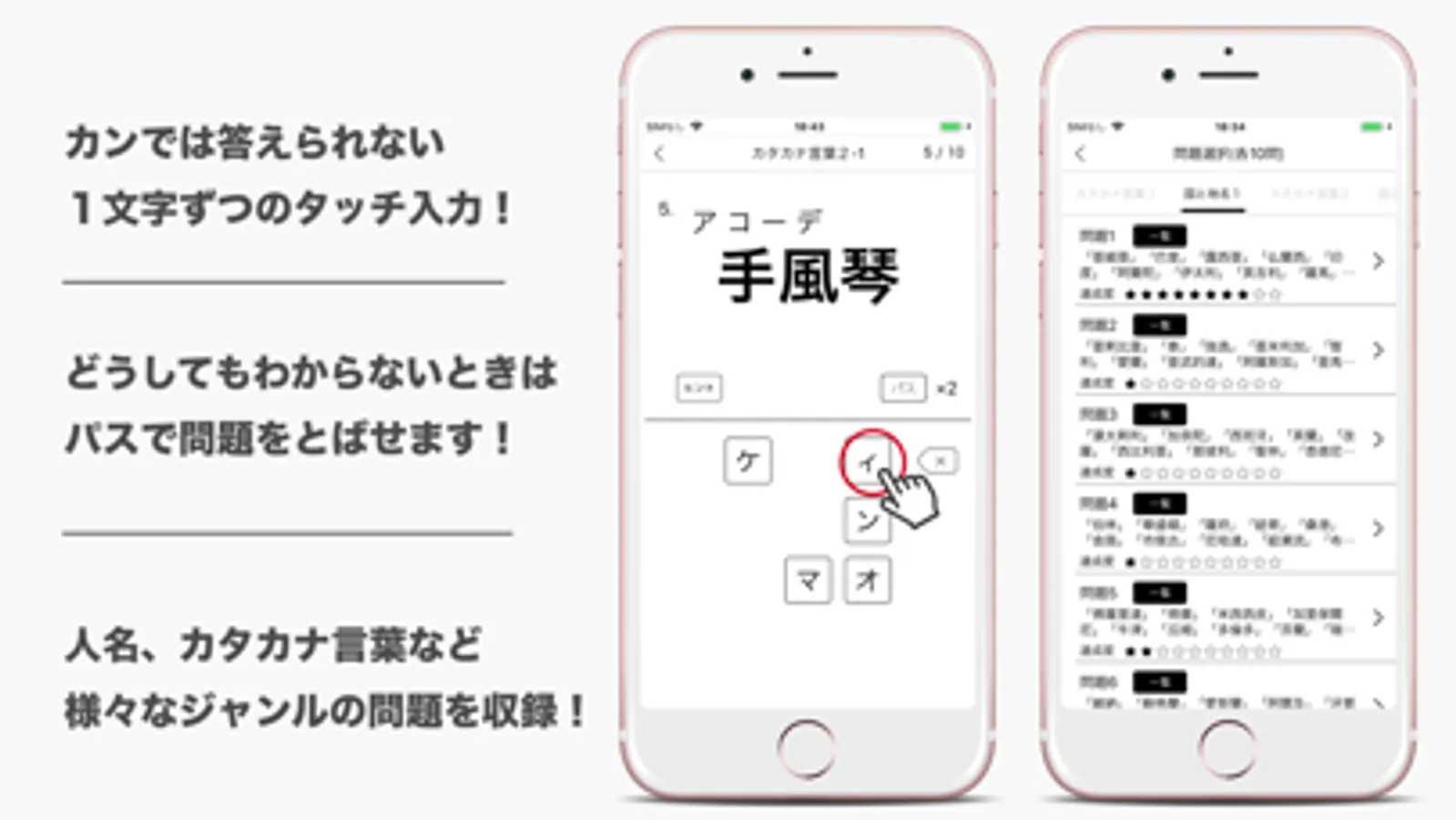 10問ずつ漢字の読みを学習できます。9個の選択文字から正しいよみがなをみつけてタッチで並べてください。