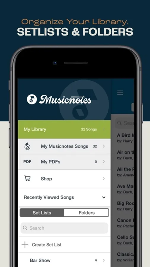 • Create set lists for quick access and easily organize your sheet music library using folders