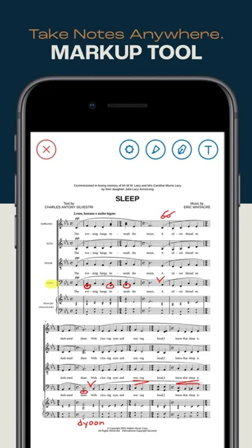 • Mark up your arrangements & scores with the built-in pen & text tools