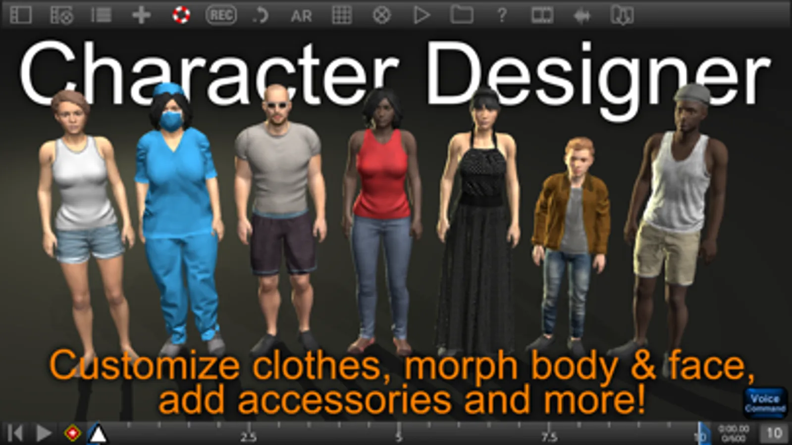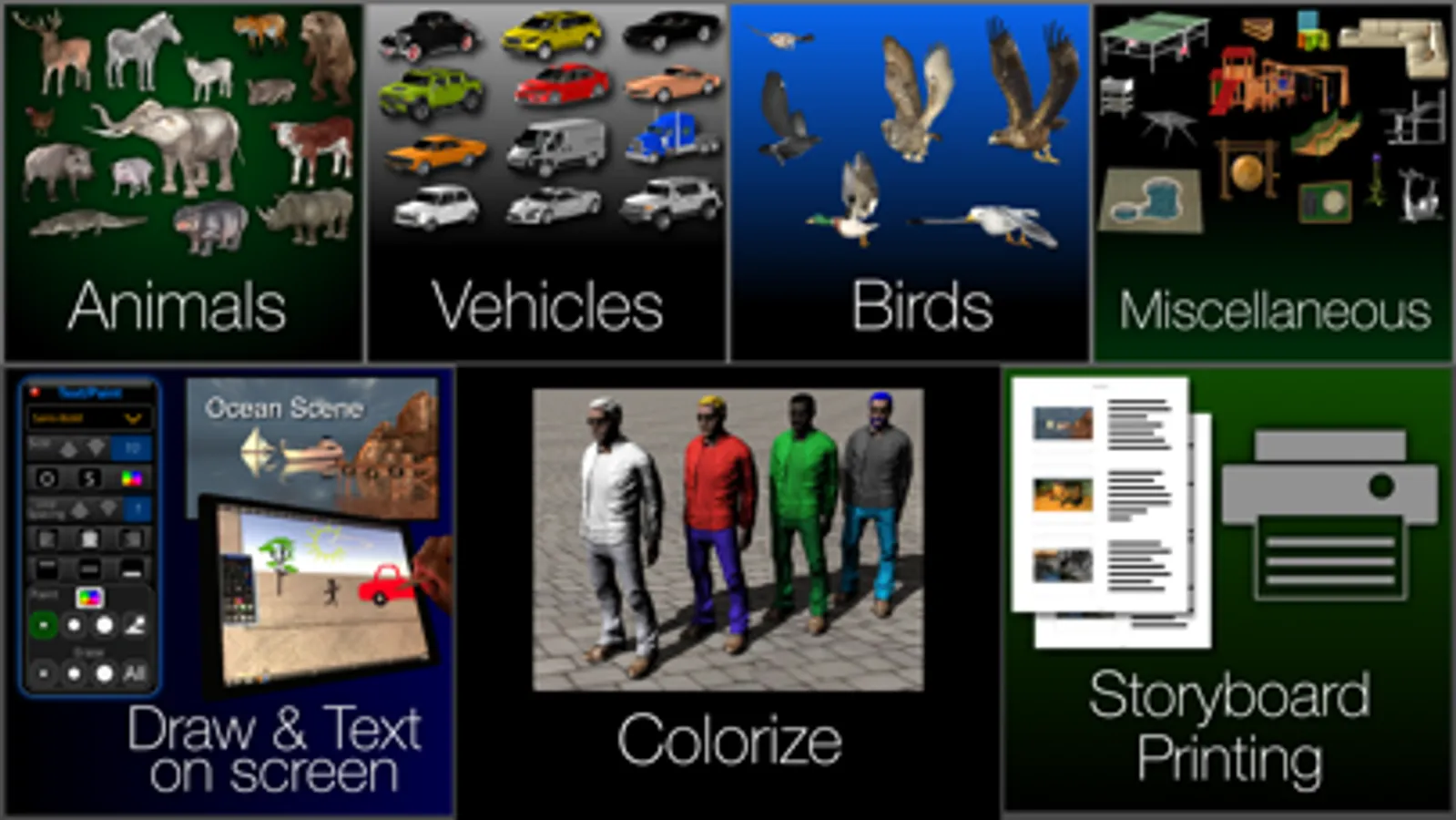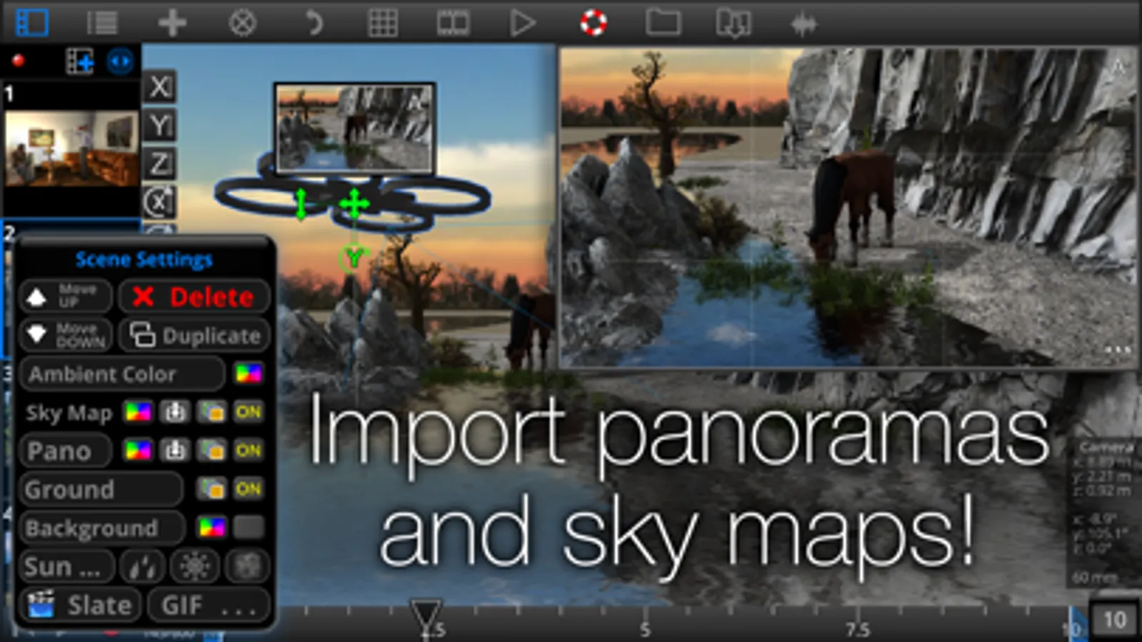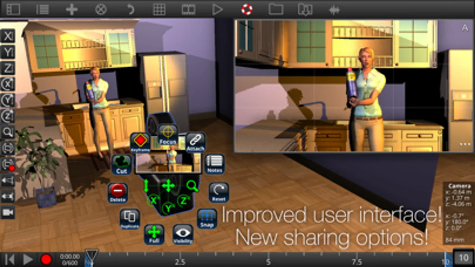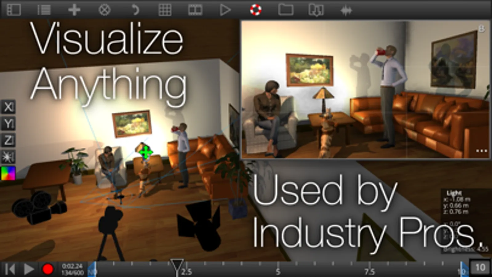 * Add movement to props, characters, cameras and lights. Simple to use key framing unlike the complex systems used in typical 3D modeling software