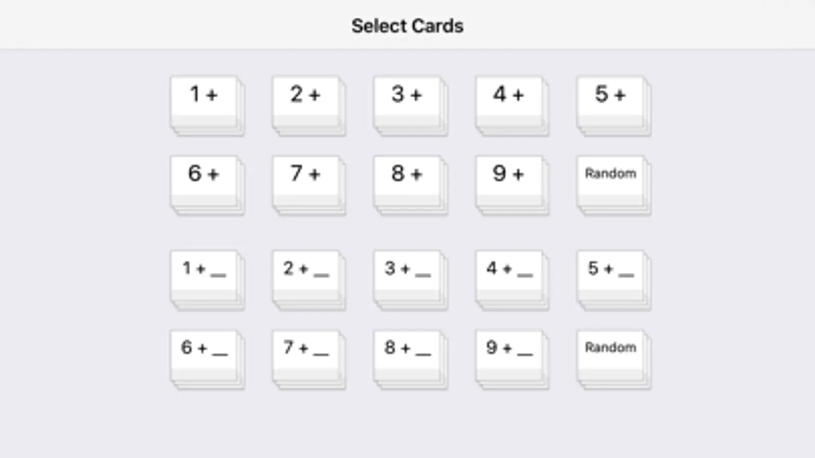 - Contains 20 sets of 10 cards (1+0 ~ 9+9, 1+_=X ~ 9+_=X)
