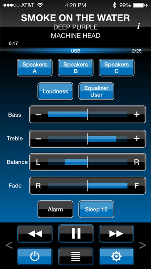 Audio menu controls - bass, treble, balance, fader, equalizer, volume and speaker selection settings