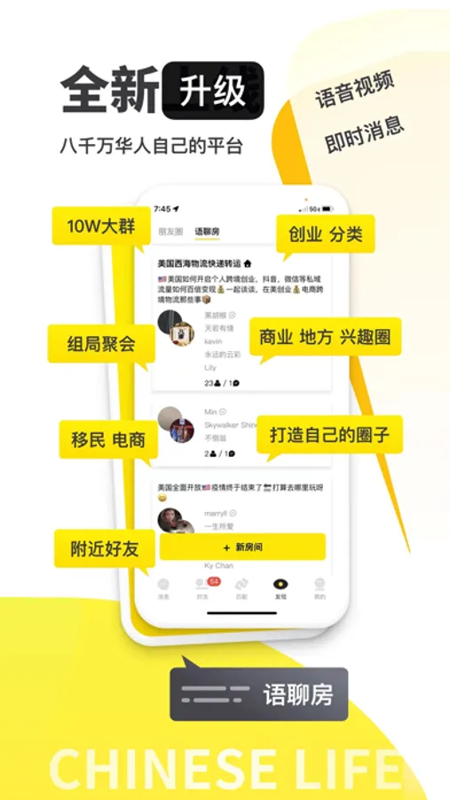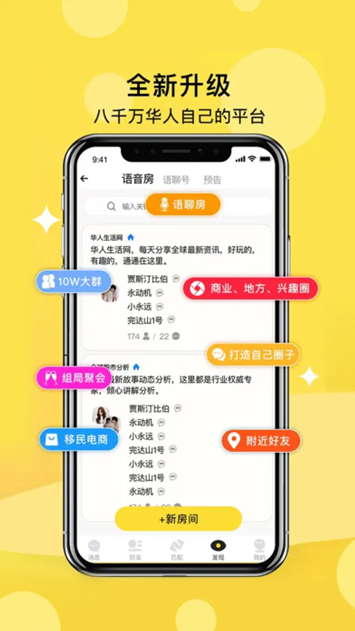 华人生活,全面升级为一个集即时通讯,语音房,10万群,私域圈子的全新生活工具平台。