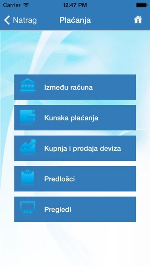 * Plaćanja - kunska plaćanja, prijenosi između vlastitih računa unutar banke i kupoprodaja deviza