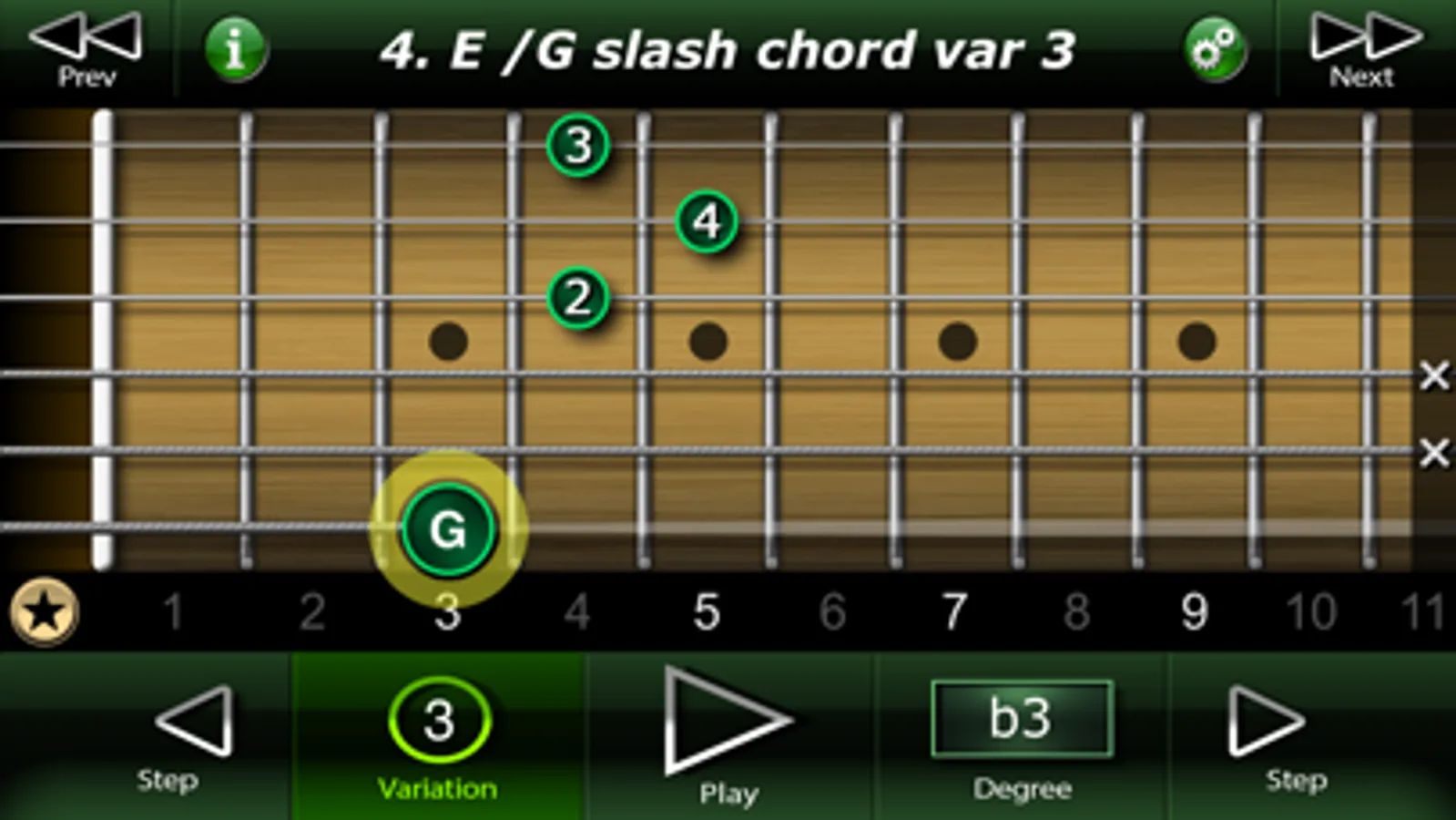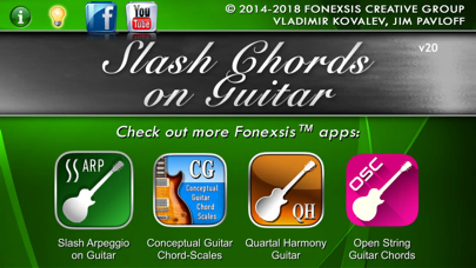 The Slash Chords on Guitar app presents you 24 types of slash chords (12 majors and 12 minors), each of which consists of several variations (up to 15). You can choose the chord (type and key), choose its variation, play it fast of slow, learn what scale degrees and notes this chord is builded from, transpose chord and see the fingerings on the fretboard. Also you can explore open strings chords by using built in function "Open strings lock". Fonexsis will add more chords in free future updates.