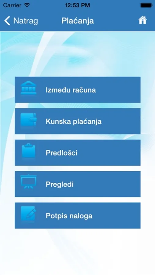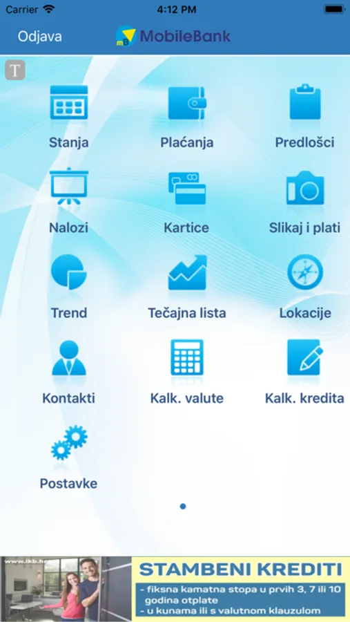 * Postavke - promjena jezika aplikacije, promjena PIN-a, promjena e-mail adrese za slanje naloga na e-mail i autorizacija otiskom prsta.