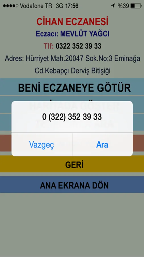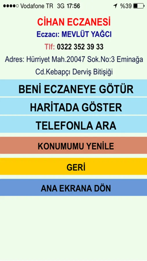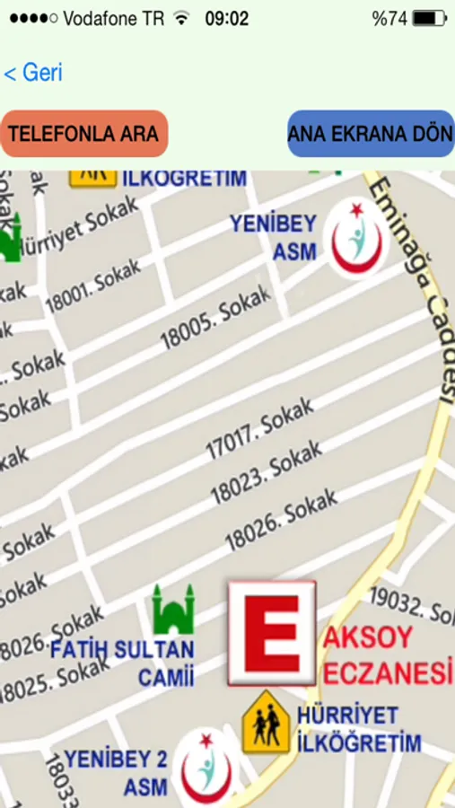 - Eczanelerin adları, adresleri, telefon numaraları ve özelleştirilmiş tarifli haritaları güncel halleriyle görüntülenmektedir.