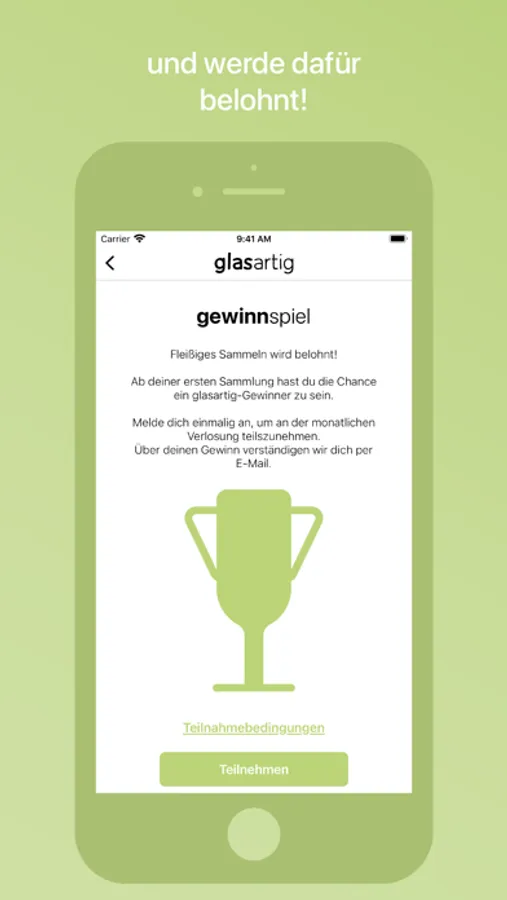 Die aktive Nutzung der App und das Altglassammeln ermöglicht dir die Teilnahme am regelmäßig stattfindenden Gewinnspiel von Austria Glas Recycling.