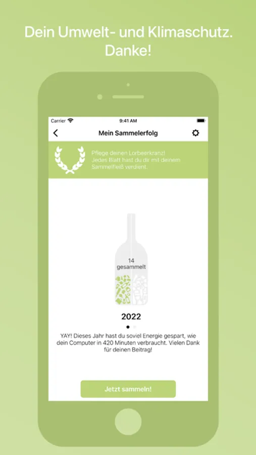 Jede einzelne Glasverpackung zählt, weil die App den Pegelunterschied beim Einwurf in den Container registriert. Sollte die Messung nicht korrekt gewesen sein, kannst du die entsorgte Anzahl nach dem Recycling korrekt eingeben. Speichere deine Sammlung ab und teile dein Ergebnis auf Facebook, Twitter oder in anderen sozialen Netzwerken.