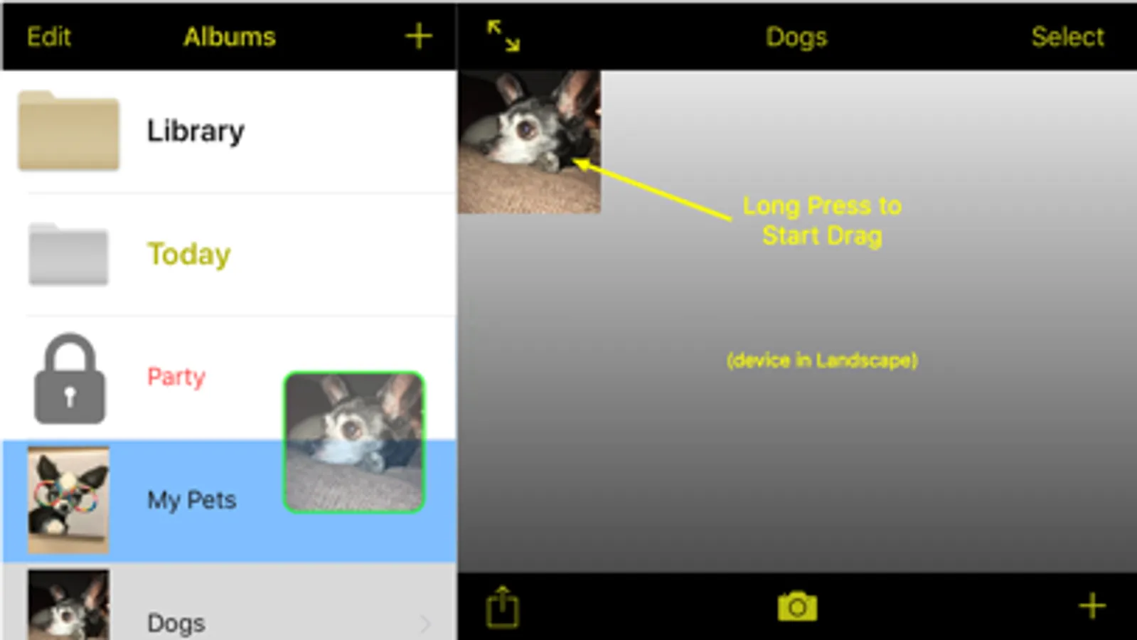 - move photos between albums via drag and drop (landscape orientation only for iPhone). Note: each photo can only belong to one user Album