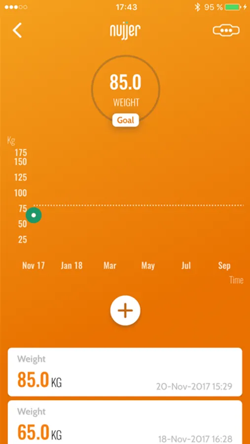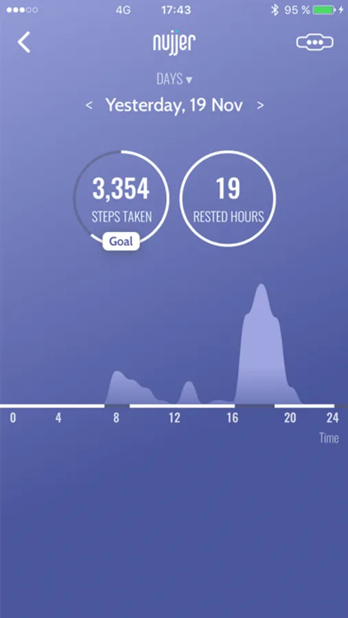 The app displays both day view and week view charts for the user to compare their activity, sleep and events. The app also enables users to enter specific goals around weight and daily step count. These are logged and further goals can be set over the course of using the nujjer app and nujjer wristband.