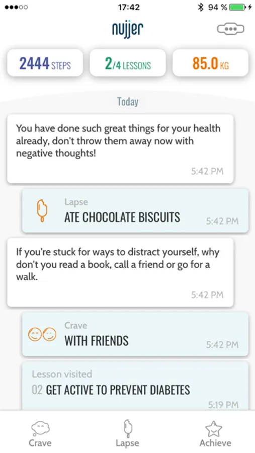 The user can log “events” using the functionality on the homescreen. When CRAVE and LAPSE functions in the app enable users to ask for support and encouragement, or be distracted, when feeling particularly vulnerable to a relapse of their lifestyle change. Nujjer learns over time what helps each individual in different situations to avoid lapses and how to predict a situation in which a crave is more likely. Users select ACHIEVE in the app when they feel they have achieved a goal and receive positive feedback on this action.
