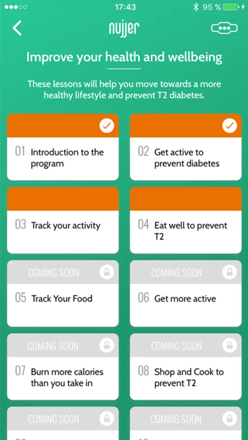 Nujjer is a digital behaviour change intervention, consisting of the nujjer app and a Bluetooth enabled nujjer wristband. Nujjer monitors the user’s activity, sleep and eating frequency and provides personalised, motivational feedback through instant messages. Version 1 app has been developed for a clinical trial in London, UK for people who are at high risk of type 2 diabetes. This Version, 1.1, is the latest development of the app. Buddi has collaborated with King’s Health Partners (KHP), a well-established and highly regarded clinical institute in the development of the content of the messages. The theoretical framework behind nujjer incorporates planned behaviour for initiation of behaviour change, and motivational interviewing to support participants in forming healthy intentions. This encourages self-monitoring of lifestyle behaviours and provides biofeedback on behaviours. The objective of the clinical trial is to demonstrate that nujjer, a digital behaviour change intervention, encourages the user to increase their activity levels, decrease their weight and reduce their risk level of type 2 diabetes. Following the trial, we expect this solution to be tailored for use by healthcare systems e.g. the NHS in the UK, to help prevent the increasing rise of type 2 diabetes.