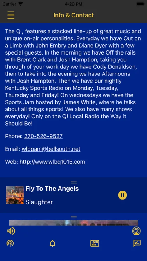 The Q is not just a radio station anymore, you can take us where ever you go with our mobile app! We have a vast selection of various classic hits and country of all your favorite artists. We provide various shows like Out on a Limb, Sports Jam and high school sports. You can listen to these shows live or relive them through our podcasts. So much music to listen to and enjoy anywhere. Local radio the way it should be.