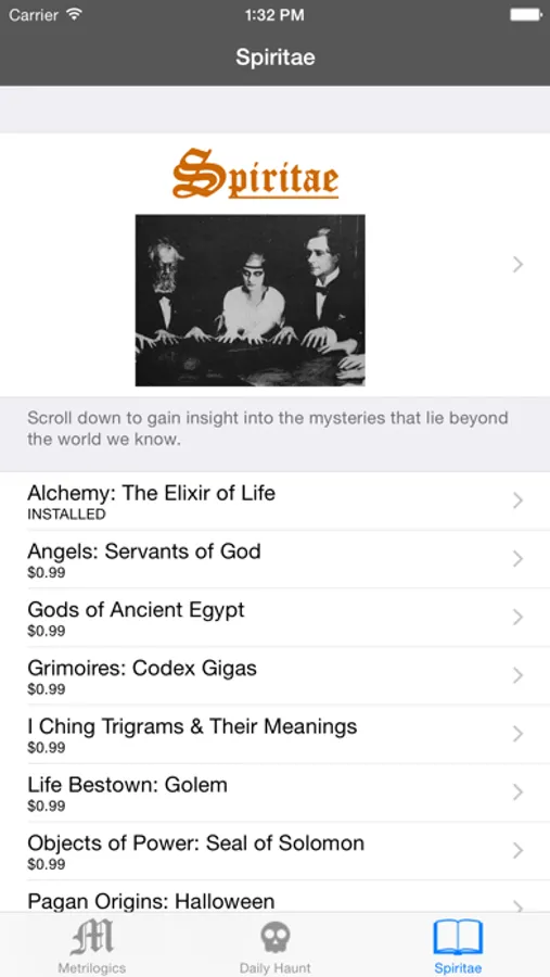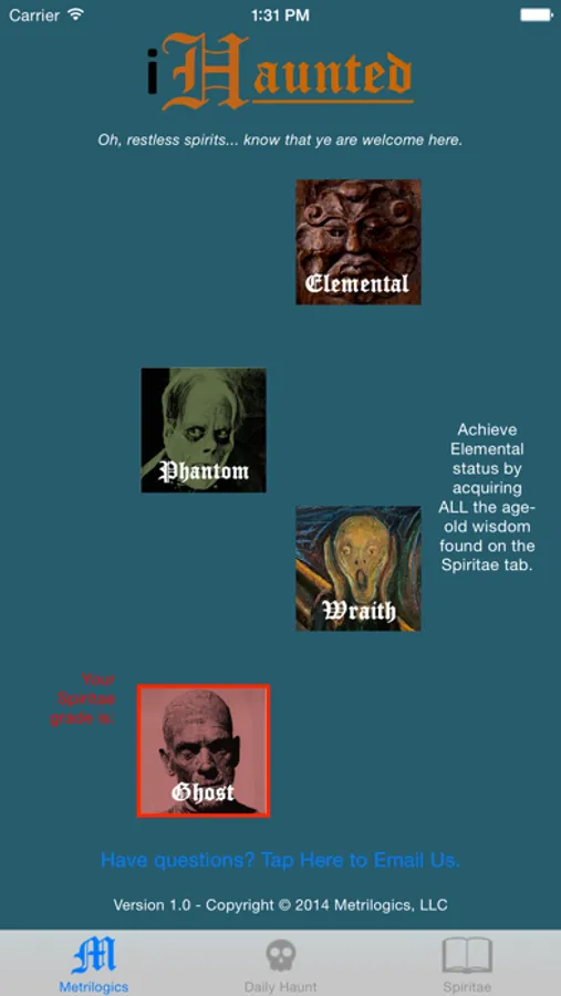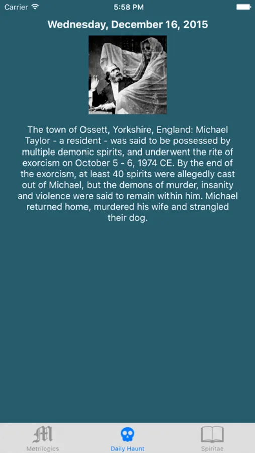 Metrilogics is happy to serve up another addition to our family of otherworldly apps: iHaunted - an insightful and informative daily reference tool that will help you learn more about the various spirits that haunt our world, the psychics that try to contact them, and the paranormal researchers who investigate both. Get all of this and more on the app's "Daily Haunt" tab.