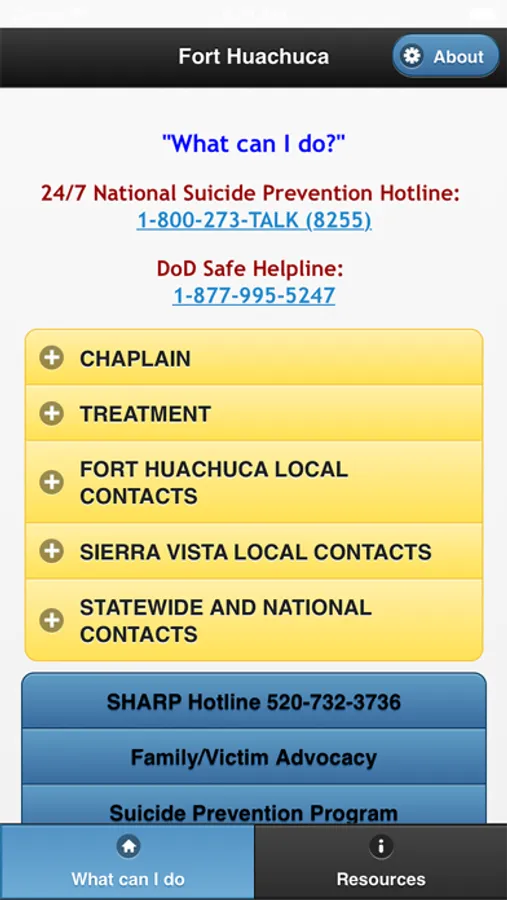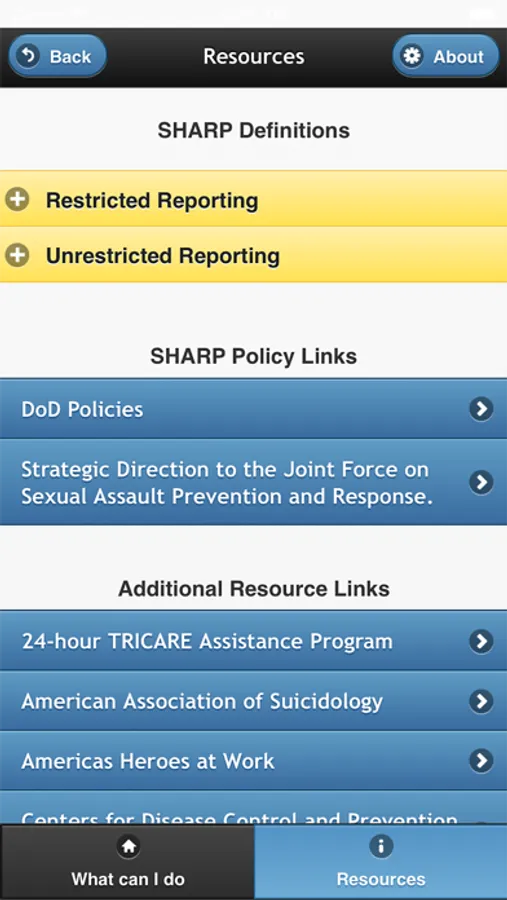 This app is to support the TRADOC Sexual Harassment/Assault Response and Prevention (SHARP) campaign plan which is designed to reduce with the goal of eliminating sexual harassment and sexual assault from our ranks. This is one of many initiatives developed to ensure that every member of our TRADOC family serves in a safe environment, free from sexual harassment and sexual assault.