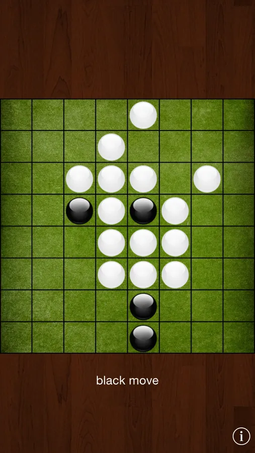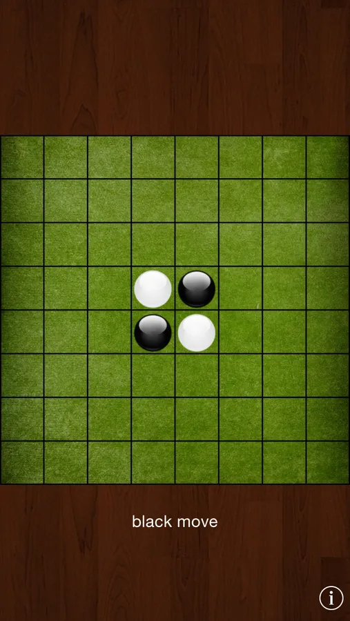 The board begins in the traditional Othello start position. Player 1 is black so you must lay a black piece by tapping on the board. With each turn you must capture one or more pieces of the opposite colour. Capture pieces horizontally, vertically or diagonally by surrounding them on both ends of the line.
