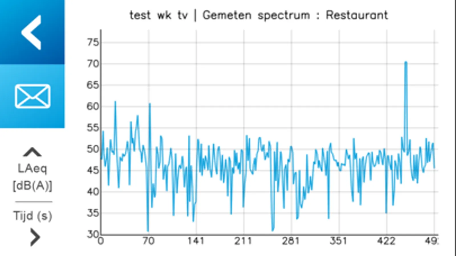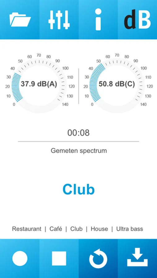 Met dBmusic kun je niet alleen het geluidniveau meten in dB(A) en dB(C), maar ook bepalen welk spectrum de muziek heeft. dBmusic beoordeelt de lage frequenties (bastonen) en vergelijkt deze met vijf standaardspectra: Restaurant - Café (pop) - Club - House - Ultra bass.
