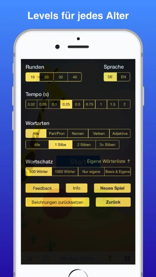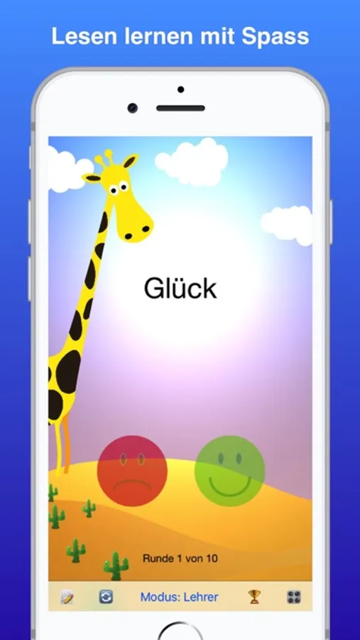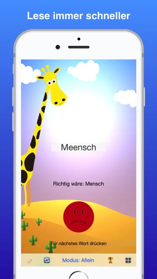 Edi the giraffe displays words for a fraction of a second. The aim is to recognize them correctly without sounding them out letter by letter. The level, speed and part of speech can comfortably be adjusted to the level of the child.