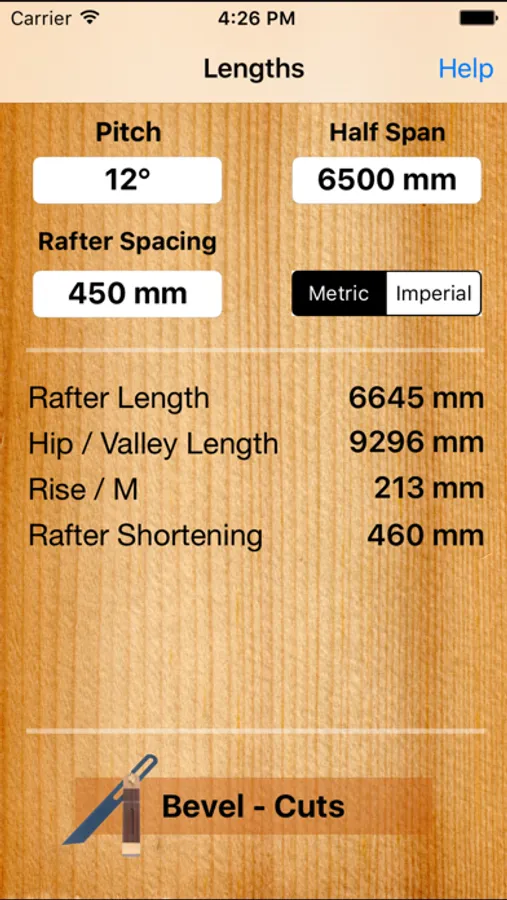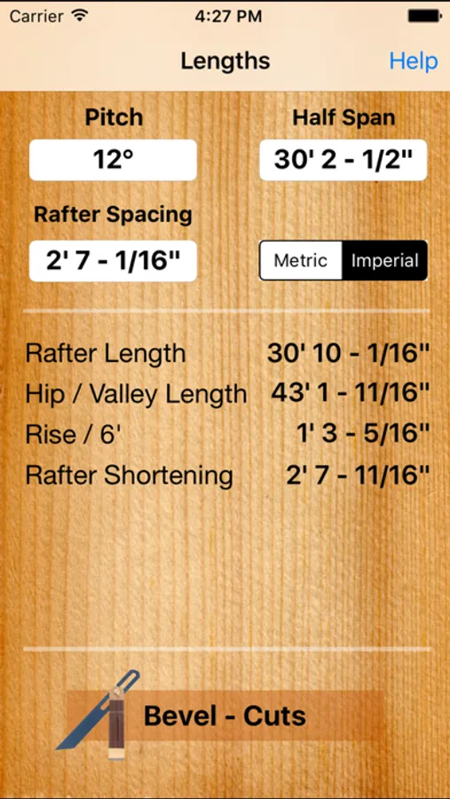 Metric and Imperial roof/rafter calculating App including plumb and foot cut angles.