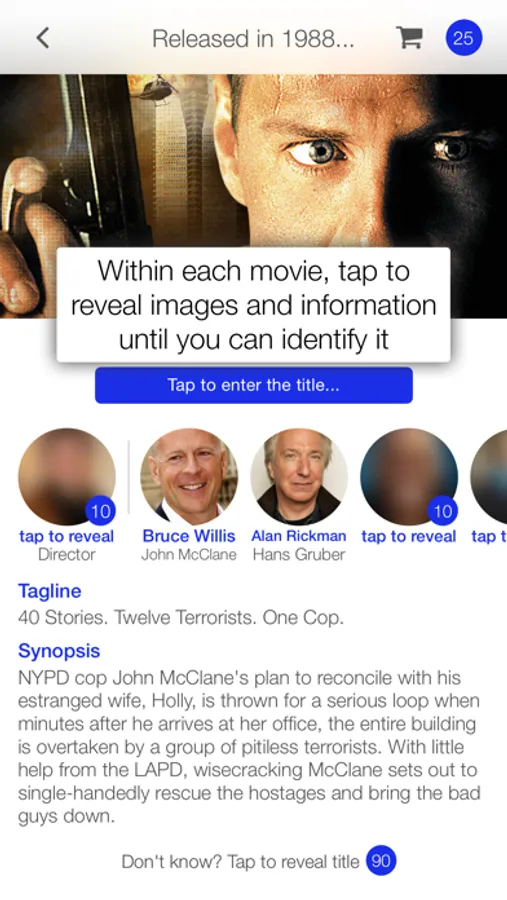 It's simple: identify a movie from its poster, cast, director, tagline and summary, revealing those clues one-by-one until you can name it.