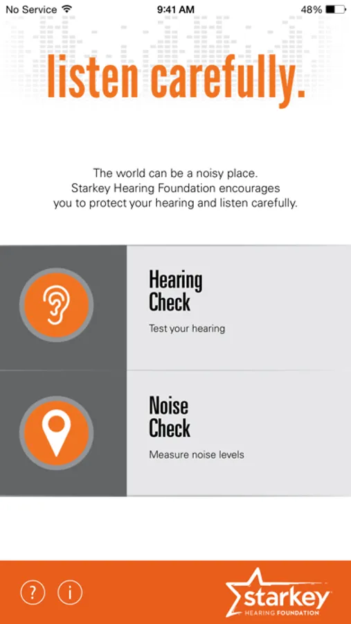 Listen Carefully is a hearing screener / sound level meter application created by the Starkey Hearing Foundation which allows you to measure environmental noise levels and to quickly evaluate your own hearing to determine if it is within a normal range, or if you have potential hearing loss.