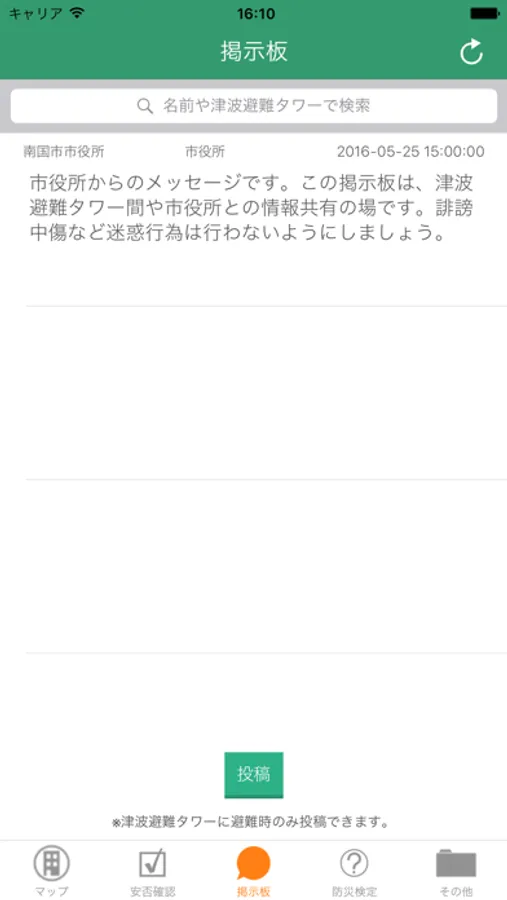 「つながっタワー」は、高知県で今後想定される南海トラフ巨大地震への対策として、高知県南国市に設置されている14基の津波避難タワーでの利用を目的としたアプリです。本アプリには、南国市にある津波避難タワーに避難した場合、タワーに設置されているiBeaconの電波によってアプリが自動起動し、簡単に安否確認のための避難情報を送信することができる機能があります。また、津波避難タワー間や市役所とメッセージのやりとりができる掲示板機能があります。さらに、平常時でのアプリの利用として、14基の津波避難タワーの位置を知るためのスタンプラリー機能や防災の知識を深めるための防災検定の機能もあります。