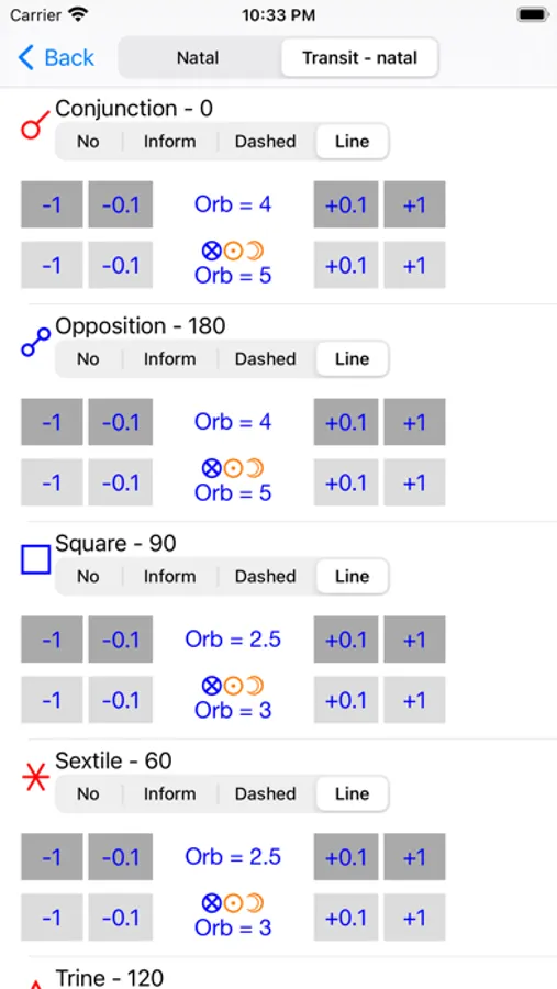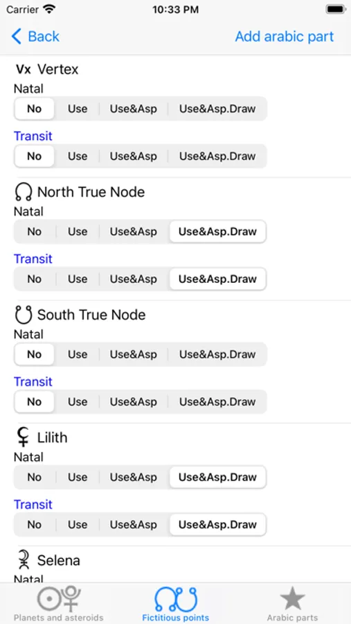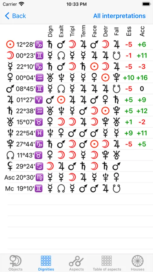 App contains essential and accidental scores table with the ability to customize the order of values calculation. There is a choice of 11 house systems, 20 types of aspect with customizable orbs and database of about 100000 places with specified time zones, so the difference with GMT is determined automatically, besides, you can add new place.