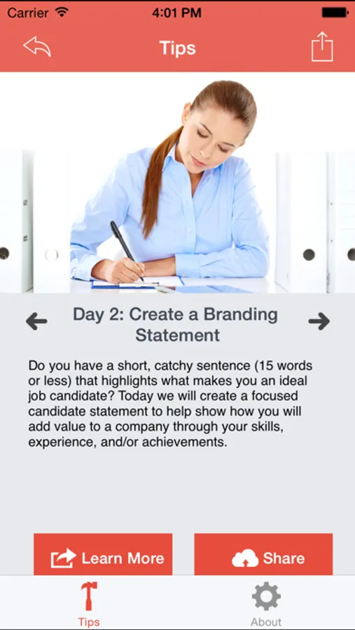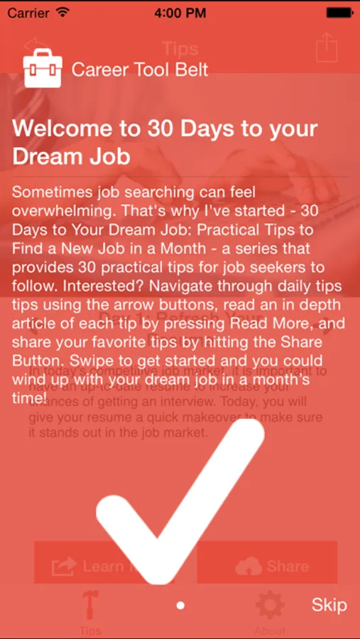 Interested? Navigate through daily tips tips using the arrow buttons, read an in depth article of each tip by pressing Read More, and share your favorite tips by hitting the Share Button. Swipe to get started and you could wind up with your dream job in a month’s time!