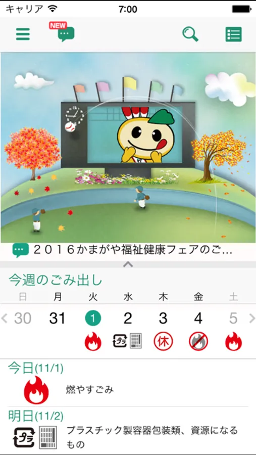 収集日変更のお知らせやイベント情報などを確認することができます。