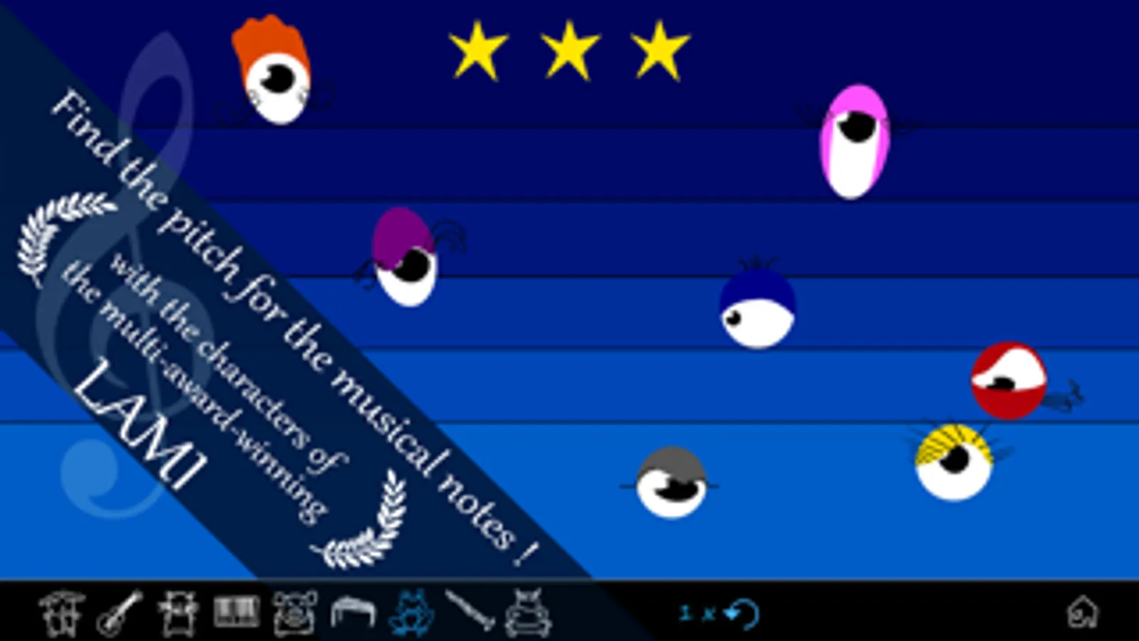 Game 1, Find Notes: Find the right pitch from instruments or animal sounds. 80 levels.