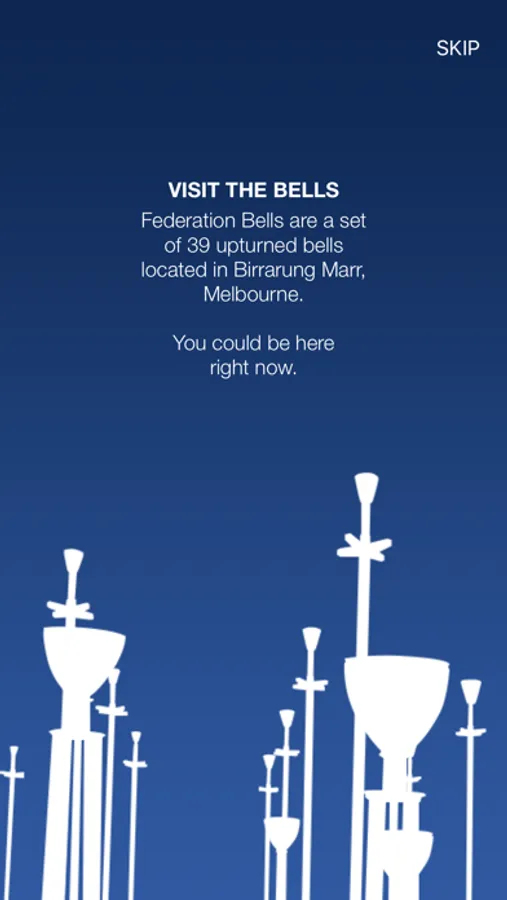 During an Interactive Session this App can control the public instrument known as the Federation Bells. Visit the Birrarung Marr, Melbourne and connect to the WiFi named "Federation Bells" to stream live songs or play a game of Simon Bells.