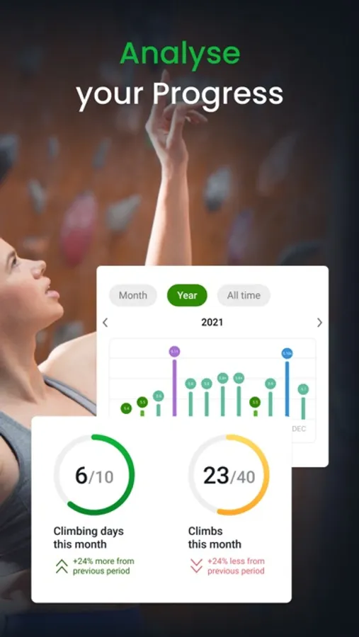 Track your indoor and outdoor climbing progress in any gym or outdoor area. Log any form of climbing, in any difficulty grading system.