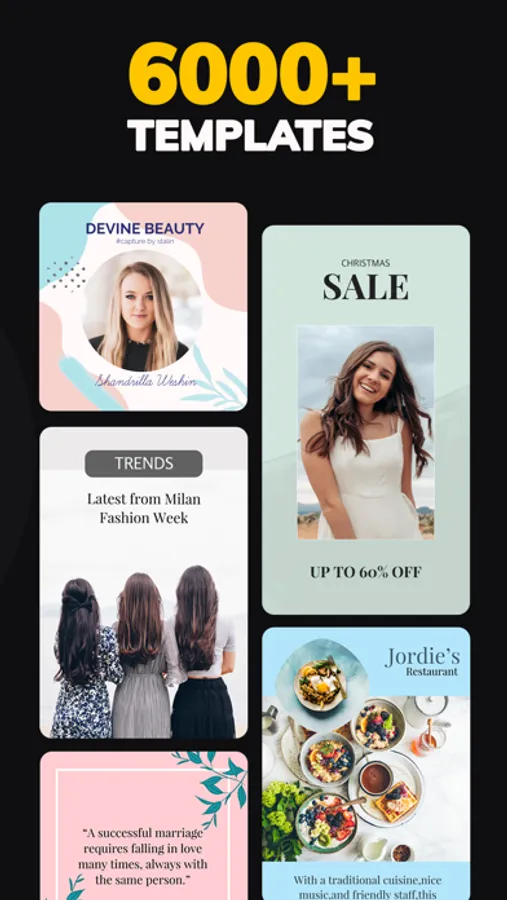 Get inspired with 6000+ predefined templates. Create amazing graphics with one tap.