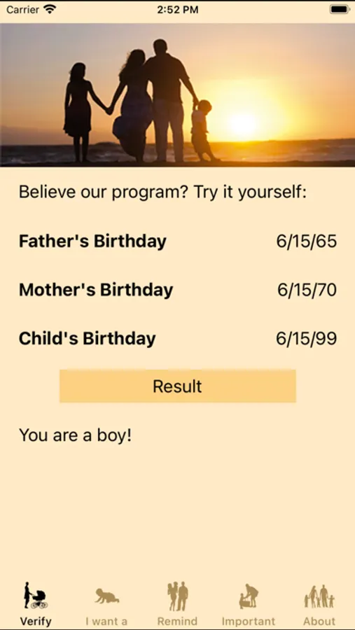 Verify: Enter your parent and your birthday. It will show your gender to give you confidence of the method. Free version allows up to 3 verify. Pro version allows to you verify unlimited times.