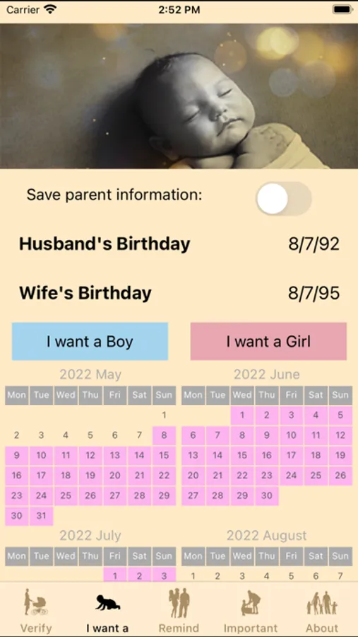 I want a: Enter parent birthday. It will show you a calendar of conception date for a boy or girl. Pink is a girl, blue is a boy, and green is hard to predict. The free version shows from previous four months and up to 6 months in the future. Pro version show you from previous 6 months up to 20 months in the future.