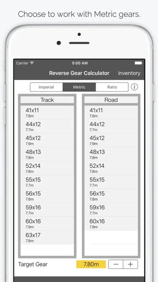 The Track Cycling Gear Calculator allows users to input their inventory of chainrings and cogs for both track and/or road bikes and it will use them to calculate target gear-inches, gear-meters, or gear ratios.